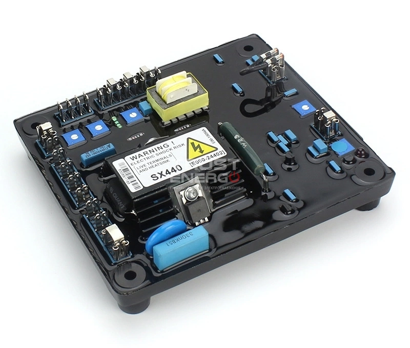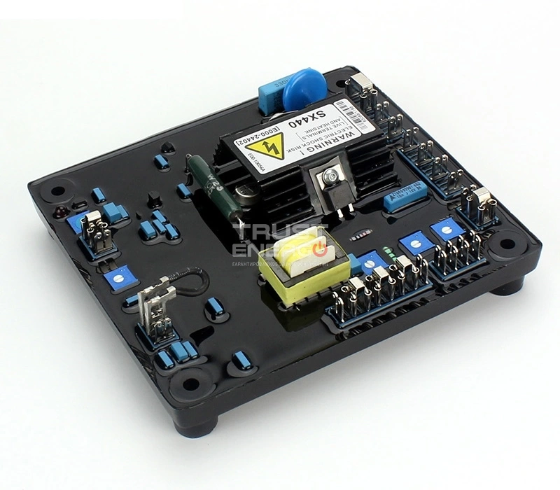 SX440 представляет собой автоматический регулятор напряжения тиристорного типа с полуволновым фазовым управлением (AVR) и является частью системы возбуждения для безщеточного генератора. В дополнение к регулированию напряжения генератора, схема AVR включает функции защиты от пониженной скорости и потери измерения. Ток возбуждения поступает непосредственно от клемм генератора. Накопление положительного напряжения от остаточных уровней обеспечивается за счет использования эффективных полупроводников в силовой схеме AVR.